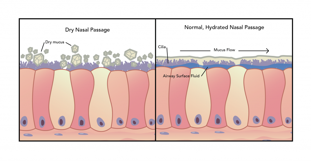 A healthy mucosa traps allergens and debris trapped in the mucus and then the mucus flows on top of the ciliary layer and then is carried away with the motion of the nasal ciliary and swallowed. When the nose is dry, the ciliary layer is no longer effective, and you end up with dry boogers or the nose tries to compensate by producing excess mucus causing congestion and a runny nose. You may therefore think you nose is wet and has too much moisture but it actually is dry.